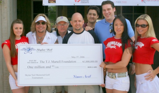 Vince Neil presented a One Million Dollar commemorative check to the TJ Martell Foundation at the 10th Annual Skylar Neil Memorial Golf Tournament on May 5, 2006, in Simi Valley, CA. The check represents the over one million dollars Vince Neil has raised over the past ten years for the TJ Martell Foundation in memory of his late daughter, Skylar. The 2006 event raised over $175,000 to help fund research for cancer, leukemia, and AIDS. Fans can help the cause by participating in the ZRock Crue for the Cure online rockathon and purchasing Skylar Neil Memorial Golf Tournament t-shirts for $20 (includes shipping). These are the same t-shirts presented to golfers and celebrities at the golf tournament. 100% of the proceeds benefit the Skylar Neil Memorial Fund and T.J. Martell Foundation to help fund research for cancer, leukemia, and AIDS.