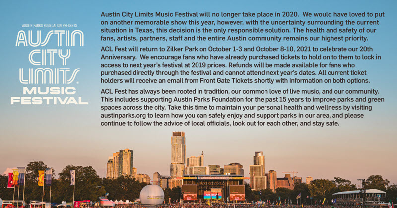 Another one bites the #COVID-19 dust as Austin City Limits Music Festival has been cancelled. #ACLFest is set to return October 1-3, 2021 and October 8-10, 2021 at Zilker Park in Austin Click To Tweet— ACL Festival (@aclfestival) July 1, 2020