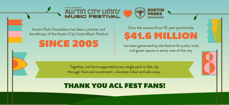 For the past 15 years, ACL Fest’s partnership with the Austin Parks Foundation has provided more than $41.6 million to improve, maintain and revitalize Austin’s public park system. This unique relationship ensures that a portion of every ACL Fest ticket purchase supports parks in every corner of Austin.