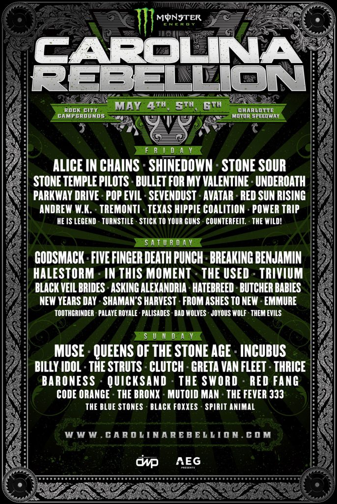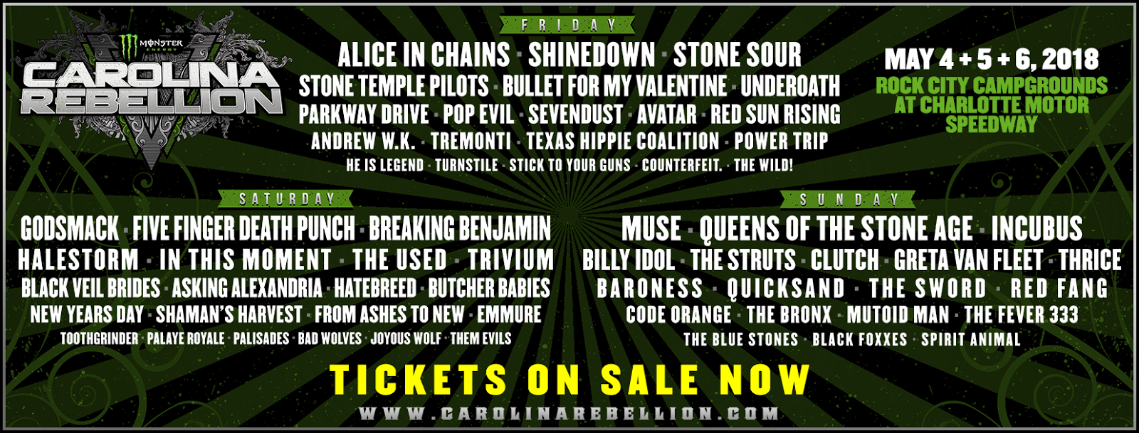 Carolina Rebellion 2018 lineup features Muse, Queens of the Stone Age, Alice In Chains, Five Finger Death Punch, Godsmack, Incubus, Shinedown, Billy Idol, Breaking Benjamin, Stone Sour, Halestorm, Stone Temple Pilots, In This Moment, The Used, Bullet For My Valentine, The Struts, Underoath, Clutch, Greta Van Fleet, and many more May 4-6 at Charlotte Motor Speedway in Charlotte, NC.