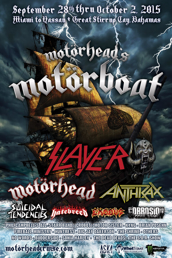 Motörhead’s Motörboat sets sail September 28 through October 2, 2015 on Norwegian Sky, departing Port Miami, with stops in Nassau and the private island of Great Stirrup Cay in The Bahamas. The Loudest Boat In The World will feature performances from some of the greatest heavy rock bands in the world, including Slayer , Motörhead , Anthrax , Suicidal Tendencies , Hatebreed , Exodus , Corrosion of Conformity, Crobot , Phil Campbell’s All Starr Band , Motor Sister , Kyng , Fireball Ministry, Huntress, Tim “Ripper” Owens and more.