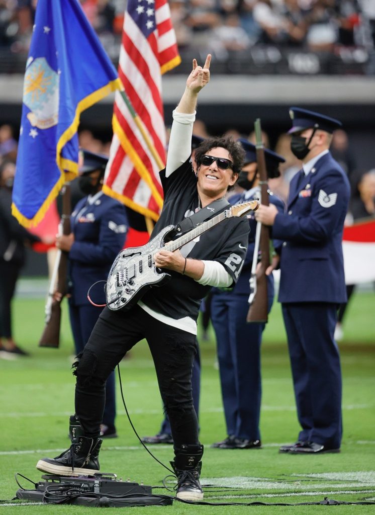 Football fans at the Las Vegas Raiders vs Chicago Bears NFL game at the Allegiant Stadium in Las Vegas, NV were supercharged, on Sunday, with a massive rendition of “The Star Spangled Banner” by iconic JOURNEY founder and guitar legend NEAL SCHON. Marking the first time that the “Star Spangled Banner” has been performed on electric guitar at the new stadium, SCHON’s performance, wielding his custom IHush Lady M Strat, pumped up the crowd for the exciting hometown match-up that saw the team’s first game with fans inside the stadium since the team moved to Las Vegas.