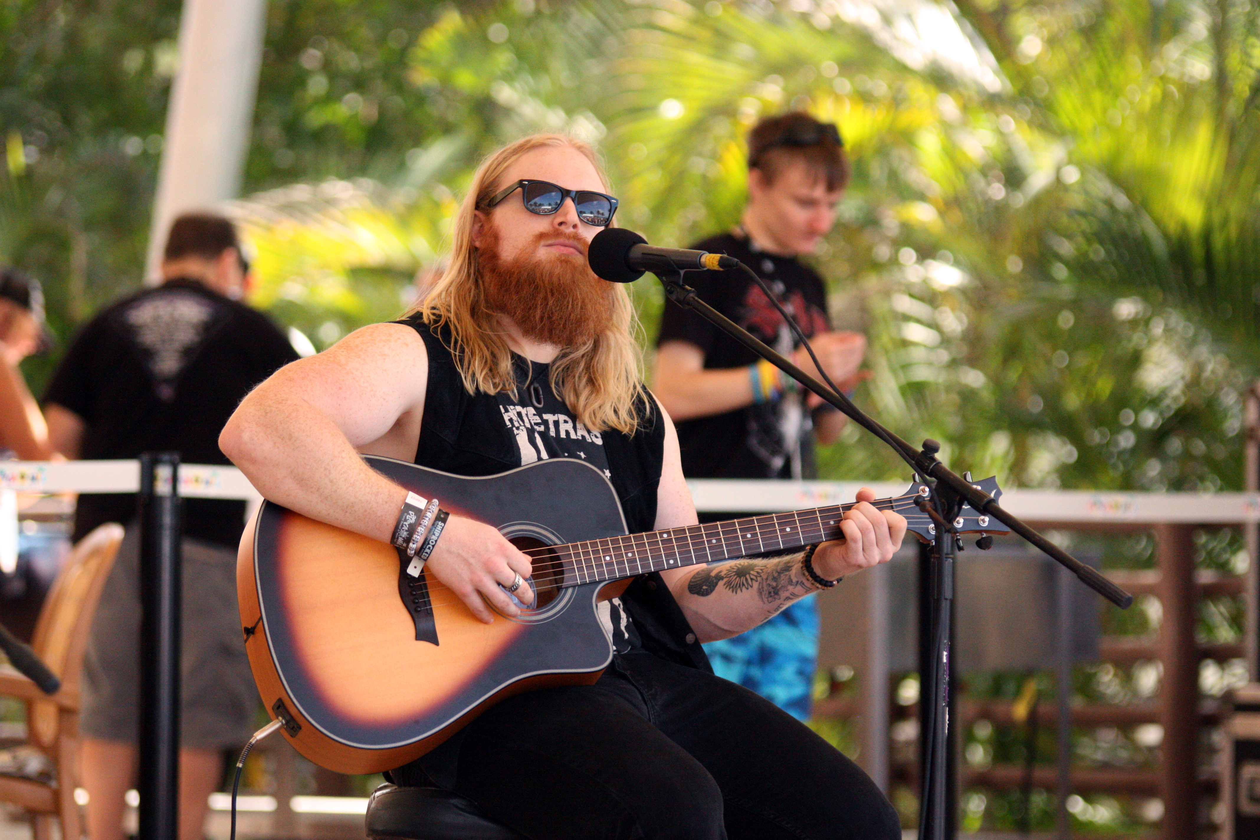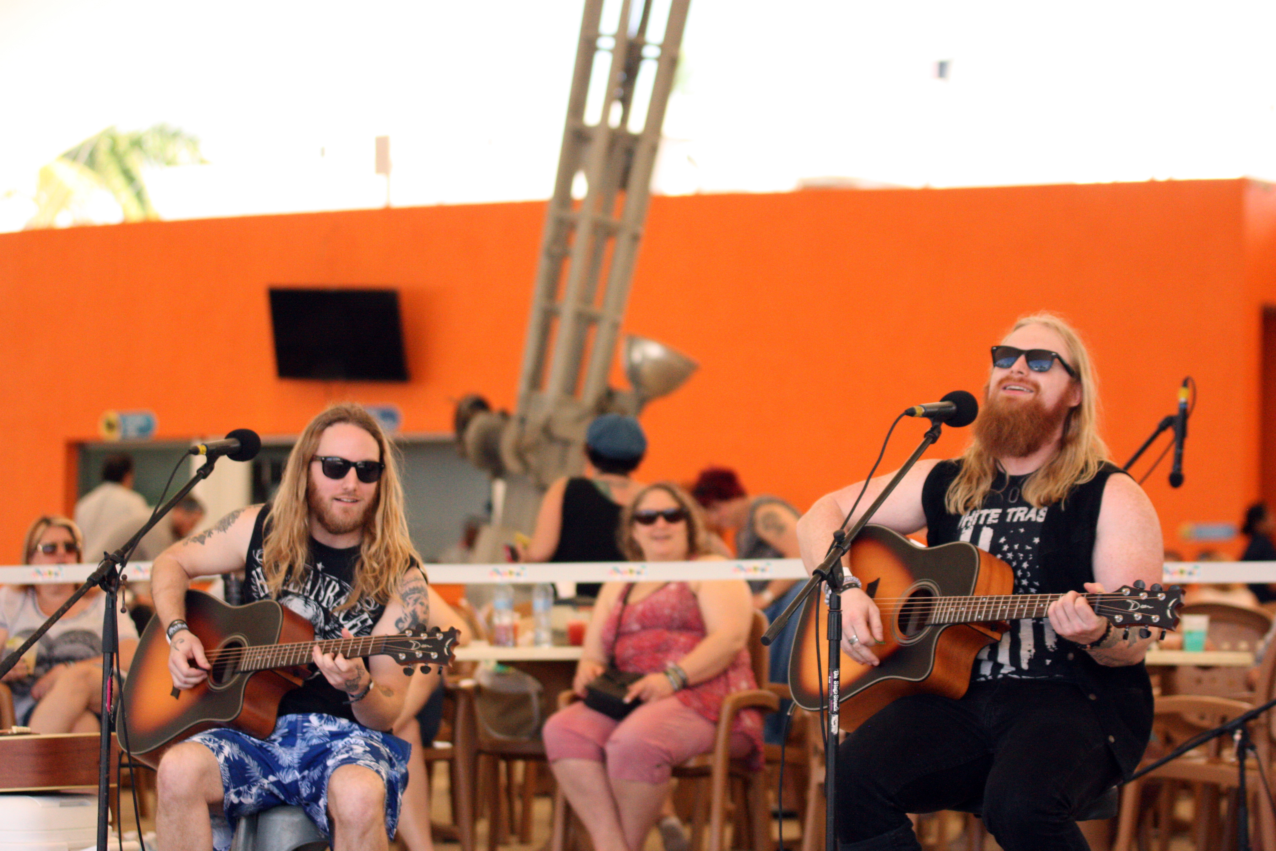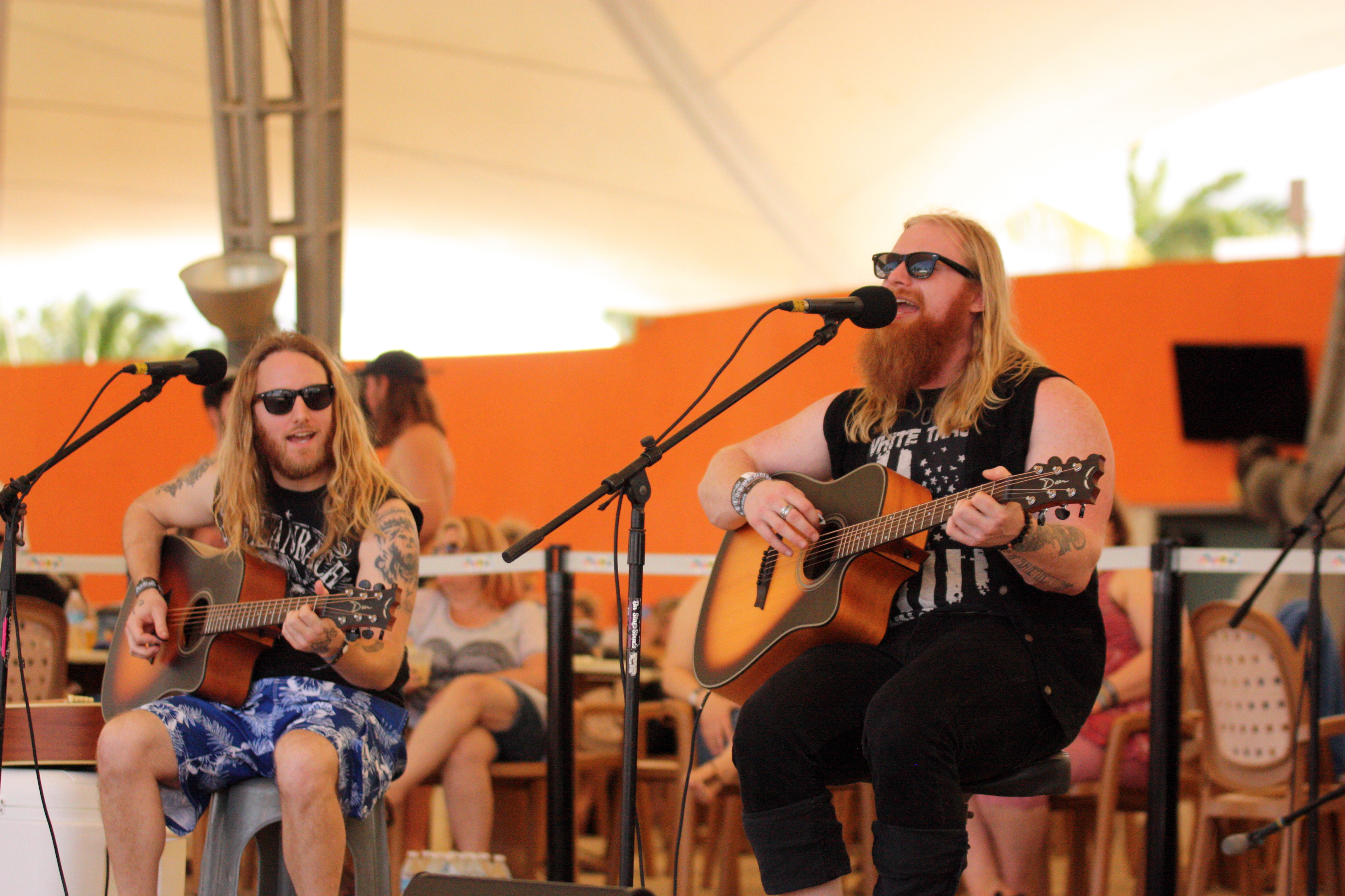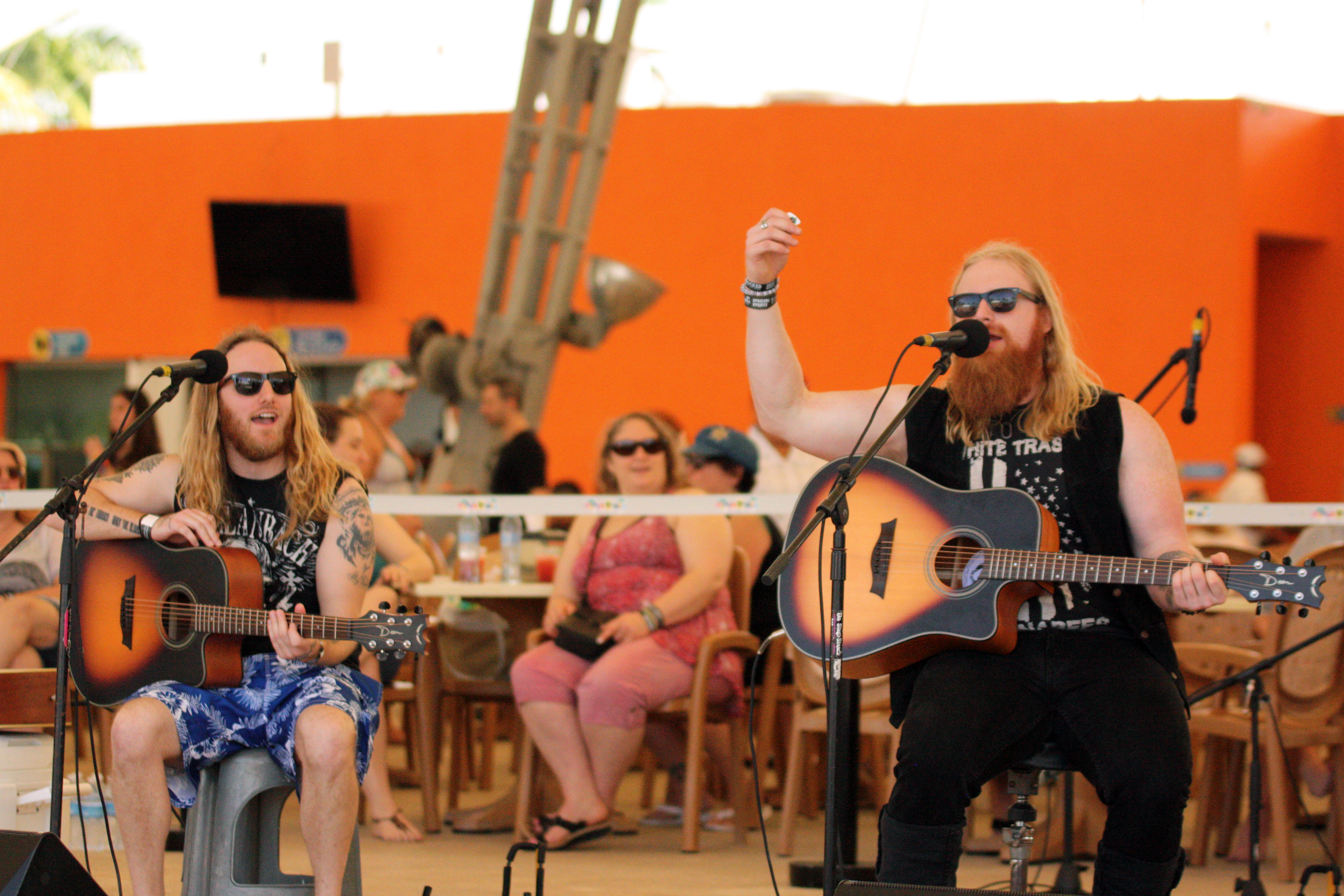 Blacktop Mojo kicked off their performances early. They played the first night of Saturday, Jan. 26th in the American Lobby. They were scheduled for two performances, but wound up playing three. The second and third performances were influenced and born out of one of those “be flexible moments.” The guys from Palestine, Texas were slated to play the beach in Cozumel on Monday, Jan. 28th. A big storm came in the night before (as many who were curled up in their room avoiding seasickness could tell you about) and destroyed the PA system. Instead of a fully plugged in set, they did an acoustic one that consisted of Alice and Chains, Stevie Ray Vaughn and original tracks like “Why.” Some fans walked up confused as their first beach set was wrapping up. There was some dilemma with ship time vs. local time and the band played a whole hour early. The Blacktop Mojo guys are so cool though, that they just played another set. At which point they had found their missing guitarist Chuck Wepfer. Vocalist Matt James interacted with the crowd, cheersing and chatting with them. Everyone was smiles during this sunny, beach performance.
