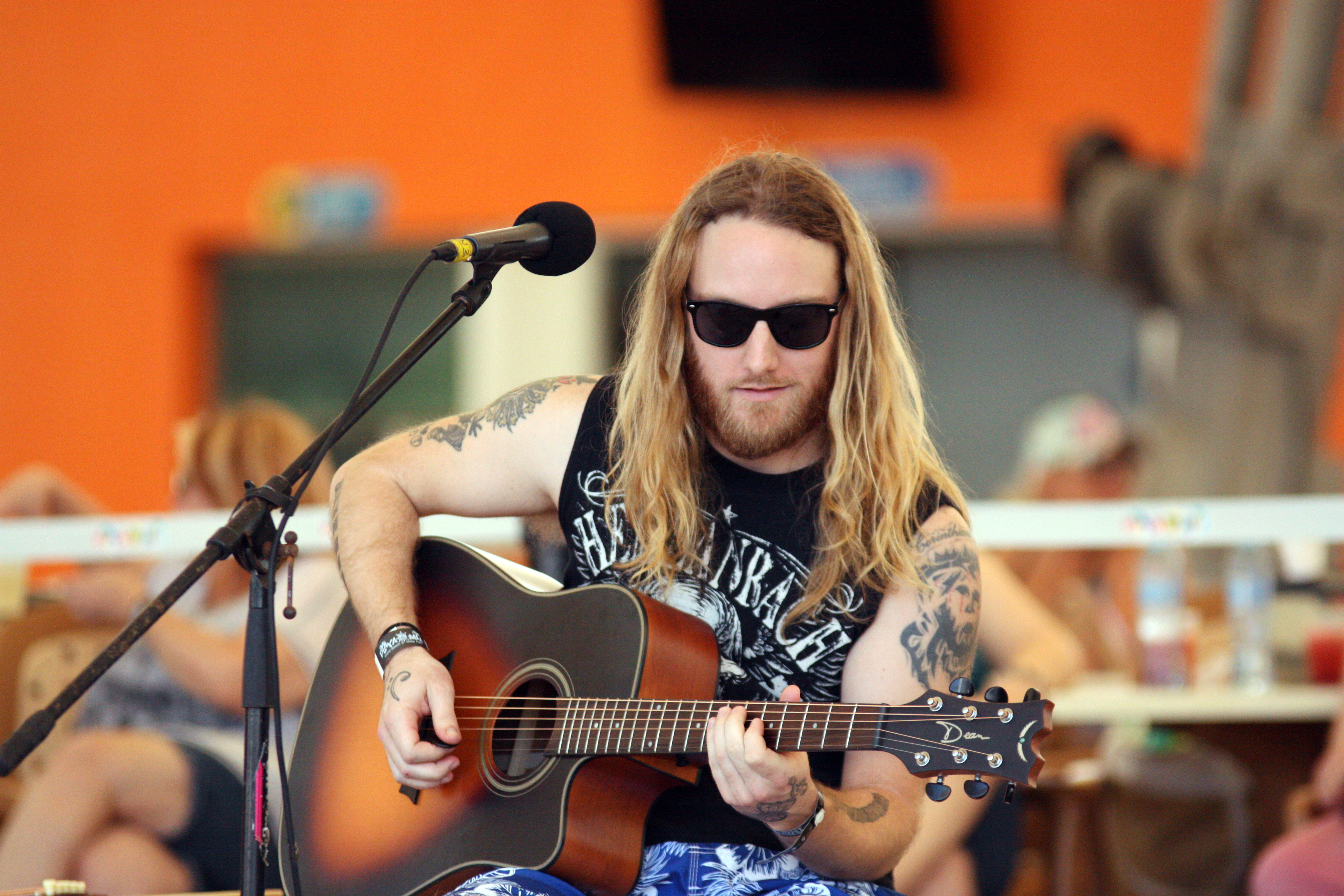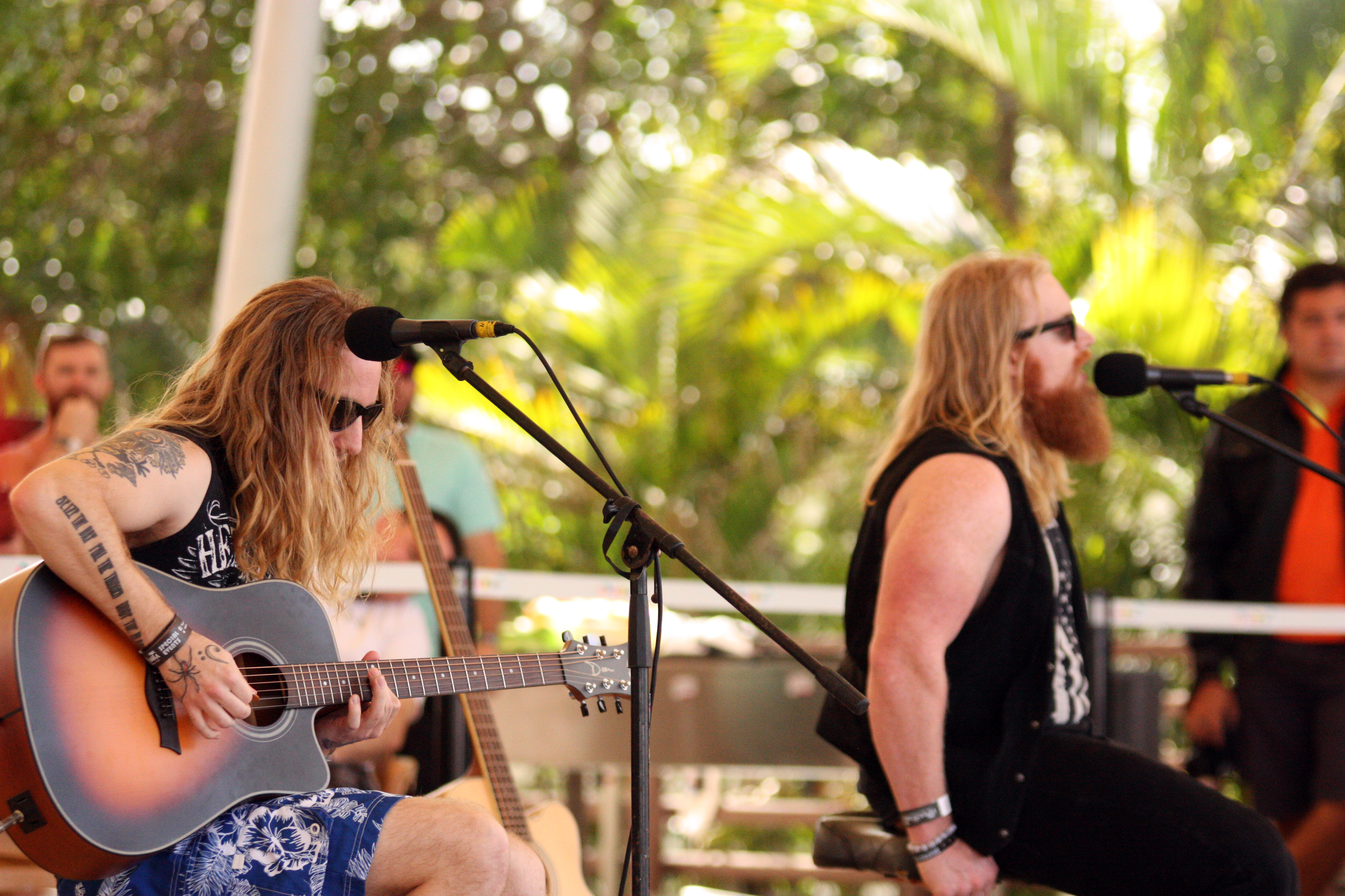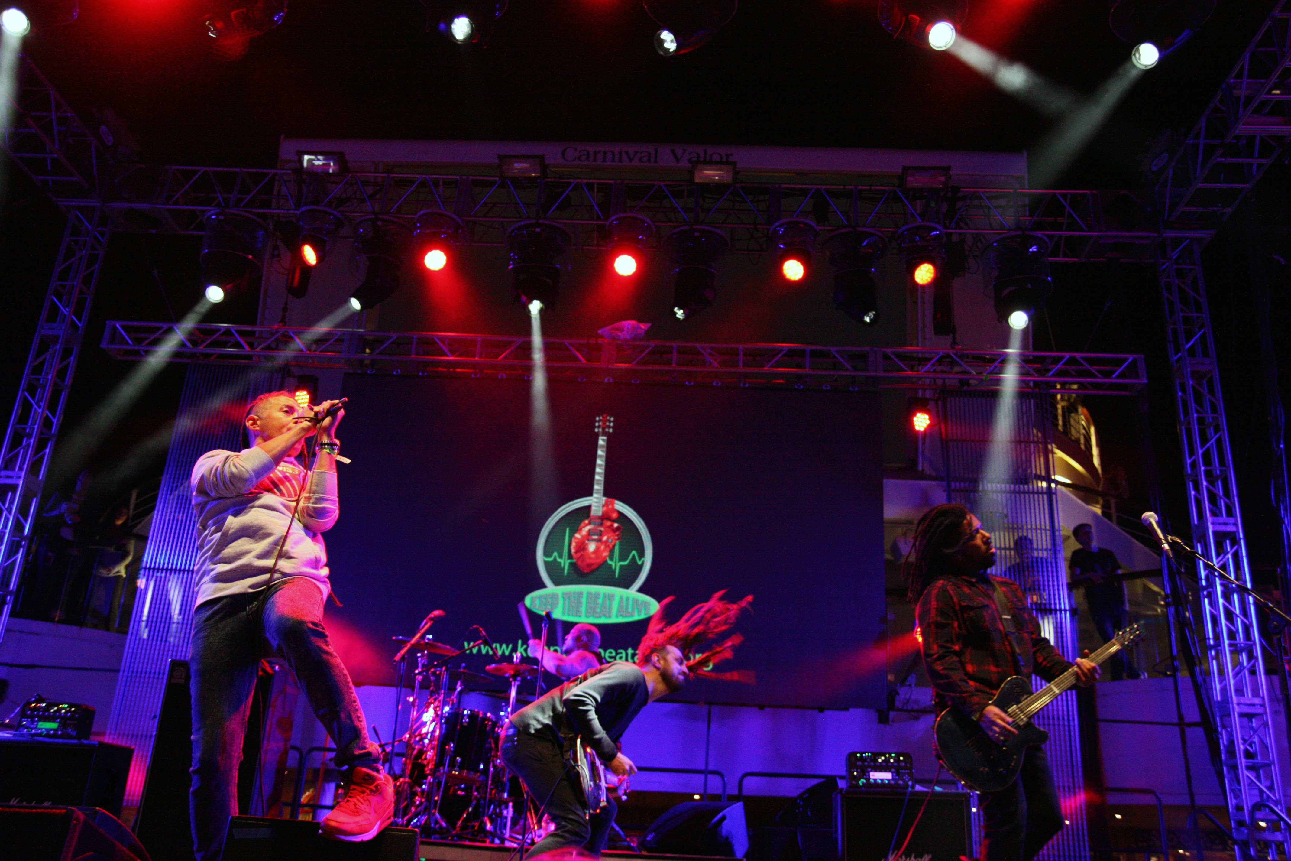Blacktop Mojo kicked off their performances early. They played the first night of Saturday, Jan. 26th in the American Lobby. They were scheduled for two performances, but wound up playing three. The second and third performances were influenced and born out of one of those “be flexible moments.” The guys from Palestine, Texas were slated to play the beach in Cozumel on Monday, Jan. 28th. A big storm came in the night before (as many who were curled up in their room avoiding seasickness could tell you about) and destroyed the PA system. Instead of a fully plugged in set, they did an acoustic one that consisted of Alice and Chains, Stevie Ray Vaughn and original tracks like “Why.” Some fans walked up confused as their first beach set was wrapping up. There was some dilemma with ship time vs. local time and the band played a whole hour early. The Blacktop Mojo guys are so cool though, that they just played another set. At which point they had found their missing guitarist Chuck Wepfer. Vocalist Matt James interacted with the crowd, cheersing and chatting with them. Everyone was smiles during this sunny, beach performance.