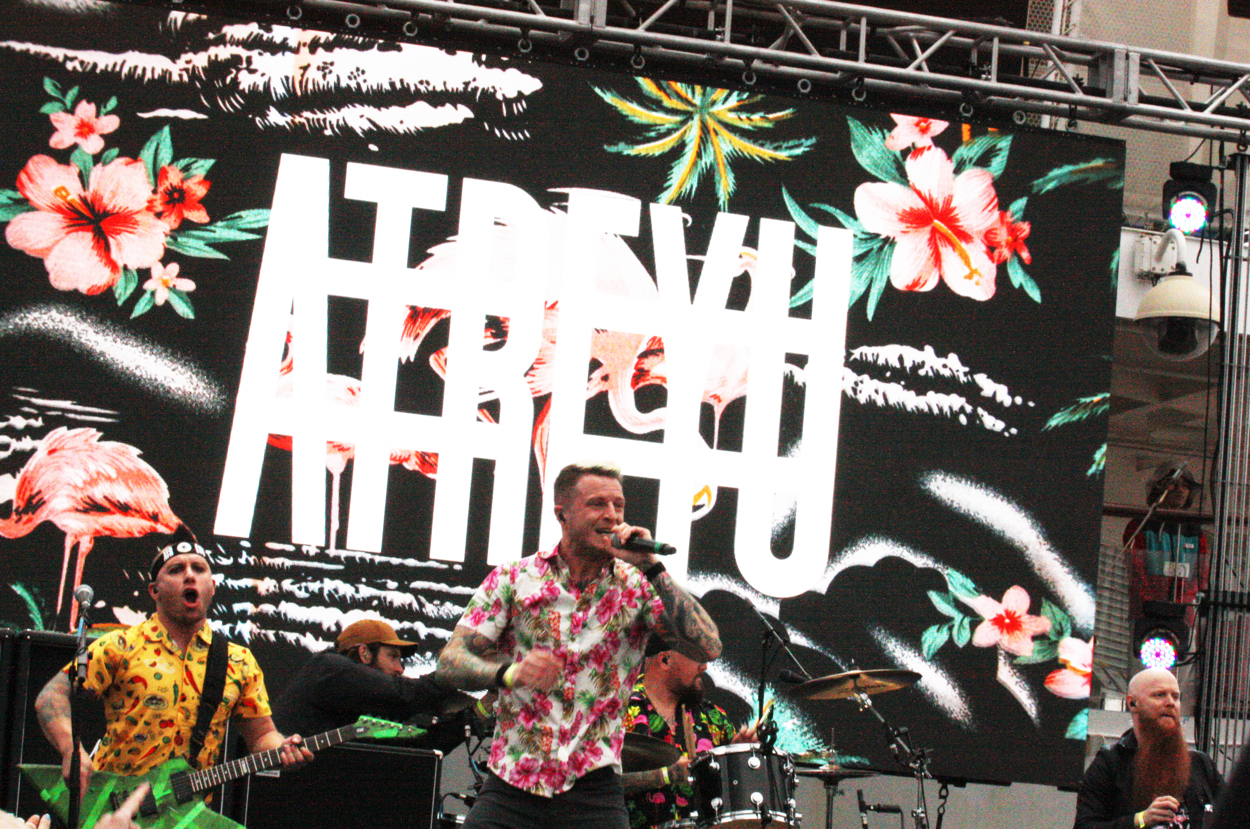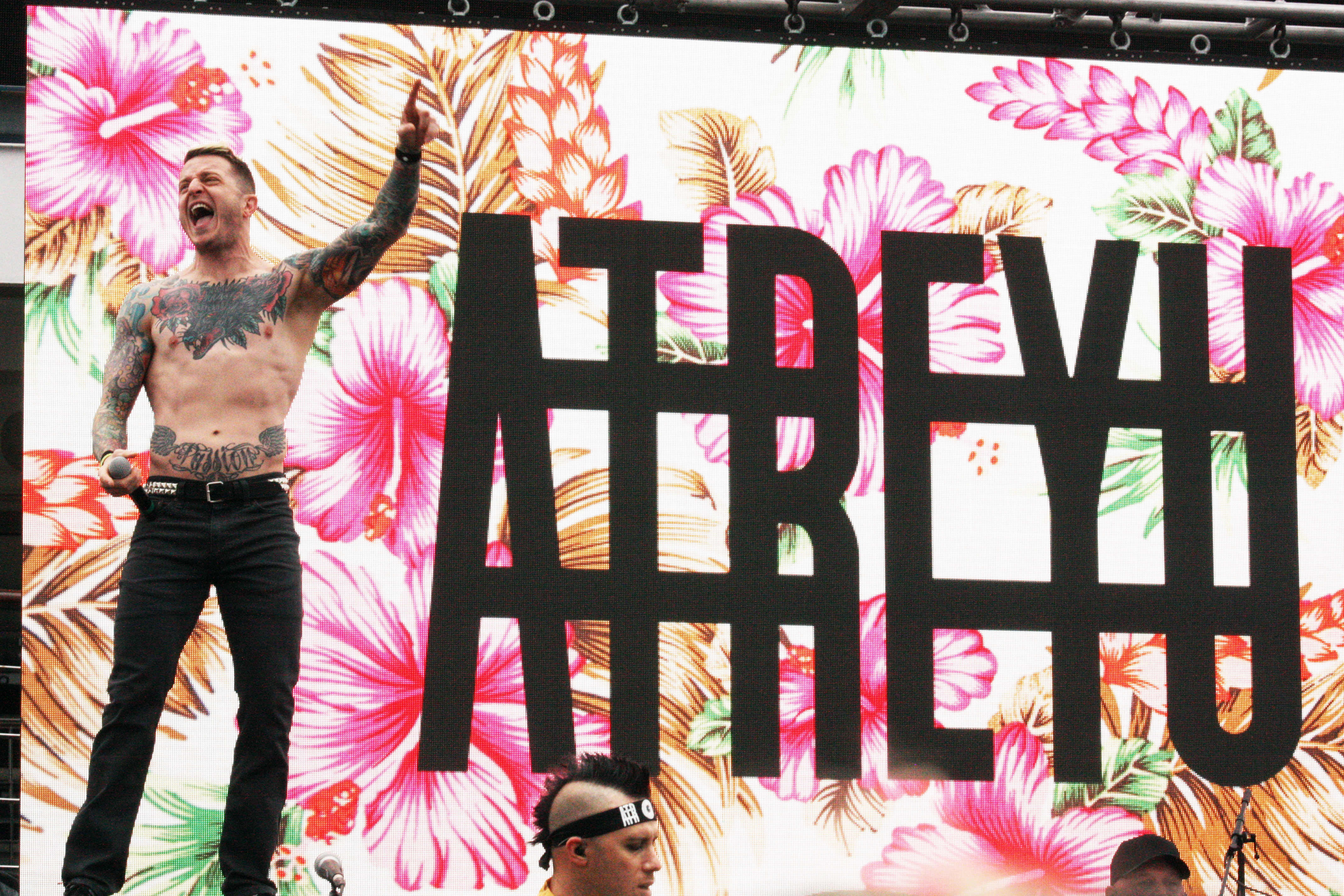 Who matches their visuals to their wardrobe? Atreyu! When the band played their second performance of ShipRocked on Wednesday, Jan. 30th they each adorned lovely, brightly colored, Hawaiian shirts. To which, it appeared that pictures were taken of and blown up and displayed under the all capital letters of “ATREYU” on the big screen behind the band as they played. The detail was clever and fit with the theme of vacation. The theme continued in their song selection.