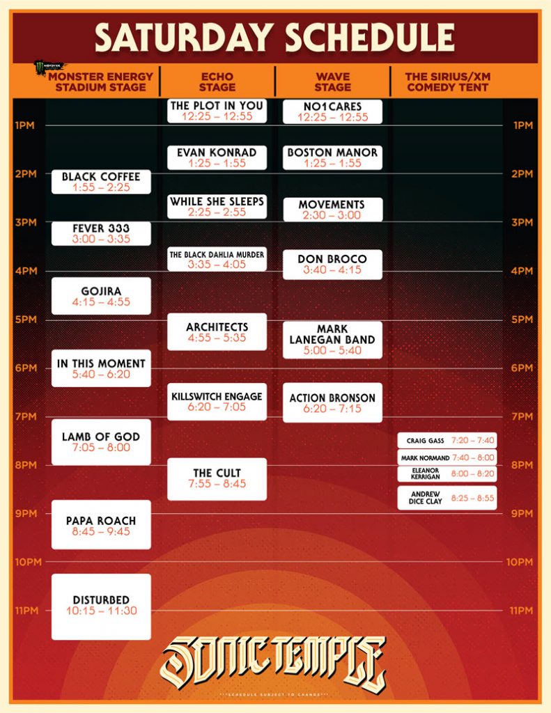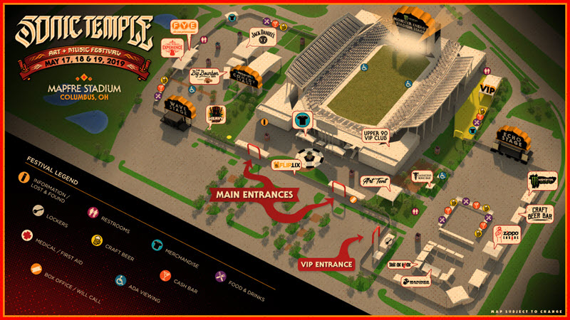 Sonic Temple set times have been announced for the first-ever Sonic Temple Art + Music Festival May 17-19, 2019 at MAPFRE Stadium in Columbus, Ohio. The festival includes performances from Foo Fighters, System Of A Down and Disturbed plus a diverse lineup that also features top artists Papa Roach, Bring Me The Horizon, Ghost, Lamb of God, Halestorm, Chevelle, Joan Jett & The Blackhearts and The Cult, as well as Andrew Dice Clay, Henry Rollins and Pauly Shore and more in the SiriusXM Comedy & Spoken Word Tent.