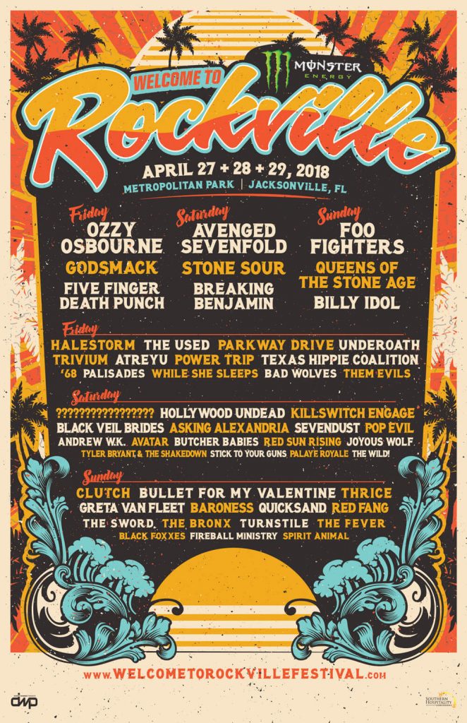 Welcome to Rockville lineup for 2018 includes Foo Fighters, Ozzy Osbourne, Avenged Sevenfold, Queens of the Stone Age, Billy Idol, Godsmack, Stone Sour, and Five Finger Death Punch as Florida’s Biggest Rock Experience grows to three days – Friday, April 27, Saturday, April 28 & Sunday, April 29 – at Metropolitan Park in Jacksonville, FL.